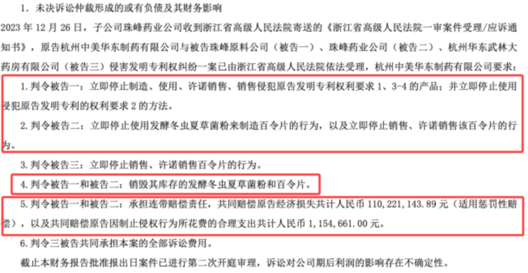 华东医药的反应是激烈的法律反击。2023年底,其以侵犯“发酵冬虫夏草菌粉”相关专利为由,将佐力药业告上法庭,索赔1.11亿元。这是一记典型的“专利阻击”,旨在从源头上扼杀挑战者的生产资格。