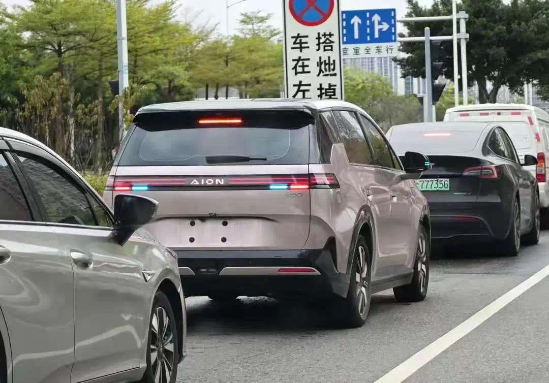埃安N60的车顶末端有小型扰流板,熏黑贯穿式尾灯+“AION”发光车标,与前灯组的设计做到了呼应,同时我们可以看到智驾小蓝灯。